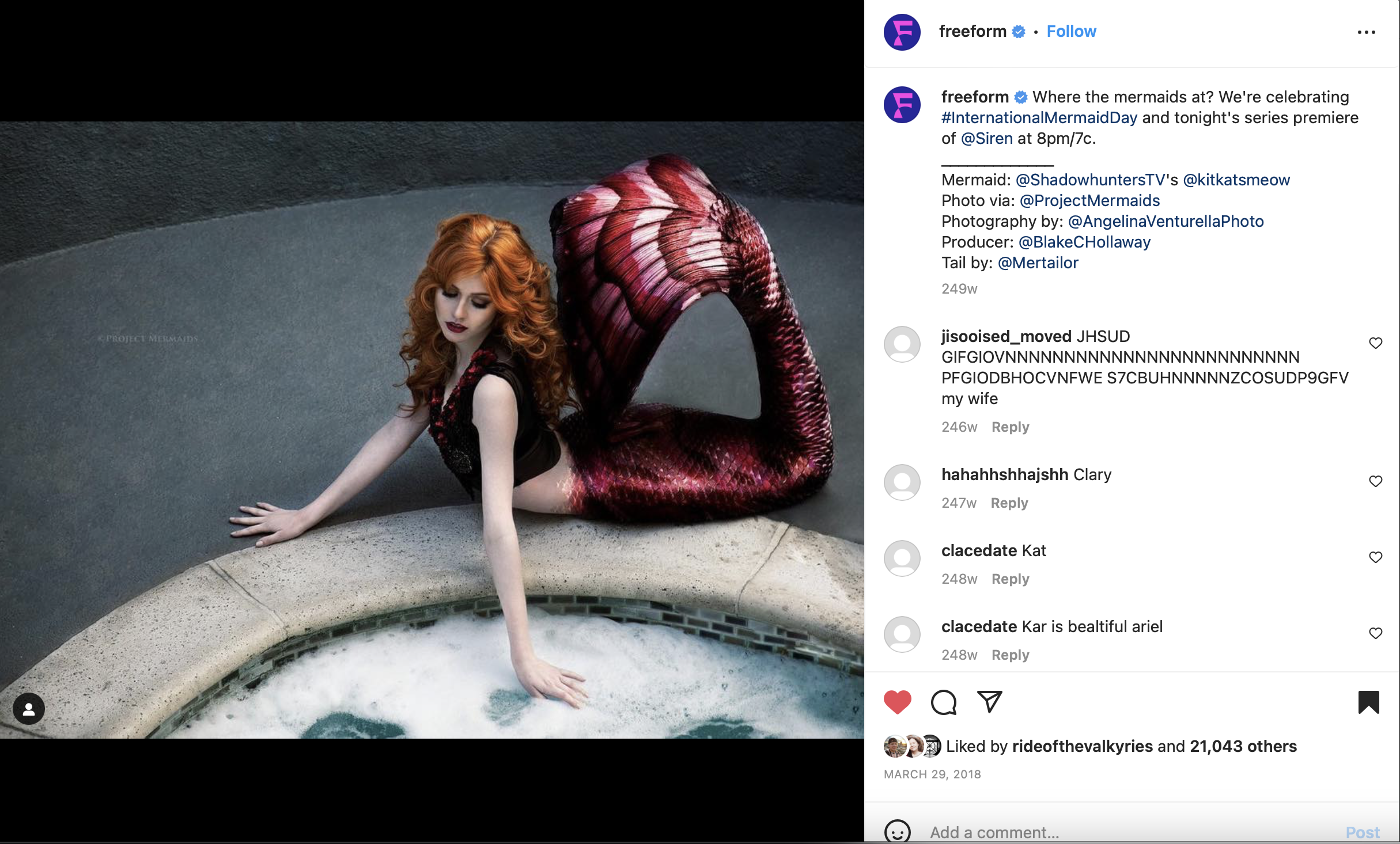 I had the privilege of being the Senior Digital Content Producer for the International Mermaid Day and Mermaid Museum social media campaigns. These collaborative initiatives involved partnerships with Freeform, PopSugar, and Project Mermaids, all with the shared goal of generating excitement, anticipation, marketing and social media buzz for the premiere of Freeform's latest mermaid television show, Siren.